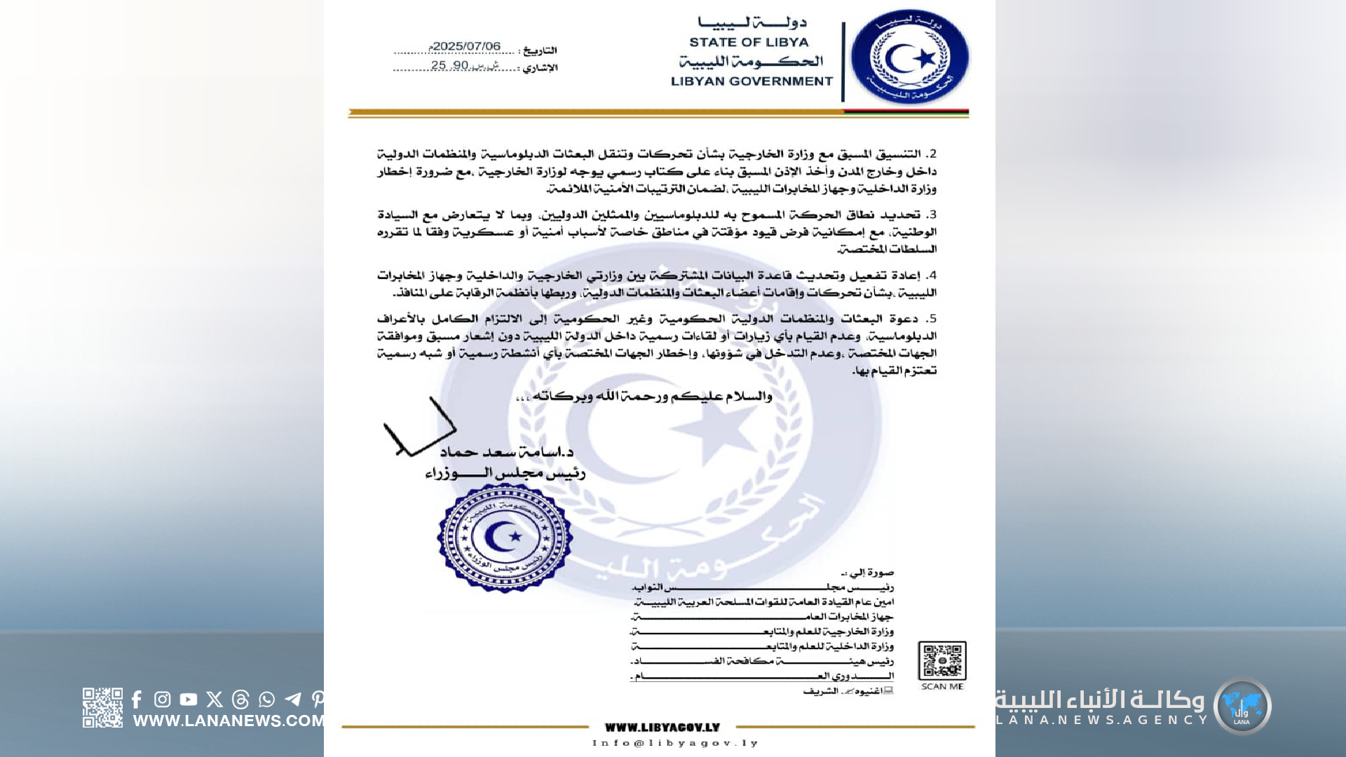 بنغازي 06 يوليو 2025 (الأنباء الليبية) – أصدر رئيس الحكومة الليبية، الدكتور أسامة حماد، تعميمًا رسميًا ينظّم إجراءات دخول وتحرك أعضاء البعثات الدبلوماسية والمنظمات الدولية، الحكومية وغير الحكومية، داخل الأراضي الليبية.