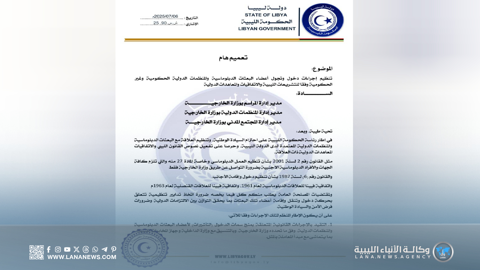 ويأتي هذا التعميم في إطار جهود الحكومة الليبية، لتعزيز احترام السيادة الوطنية وتفعيل التشريعات الليبية والاتفاقيات الدولية ذات الصلة، وتنظيم العلاقات الخارجية على أسس قانونية واضحة، توازن بين الالتزامات الدولية ومتطلبات الأمن الوطني، والتي تعكس حرص الدولة على حماية سيادتها ومؤسساتها. (الأنباء الليبية – بنغازي) ر ت