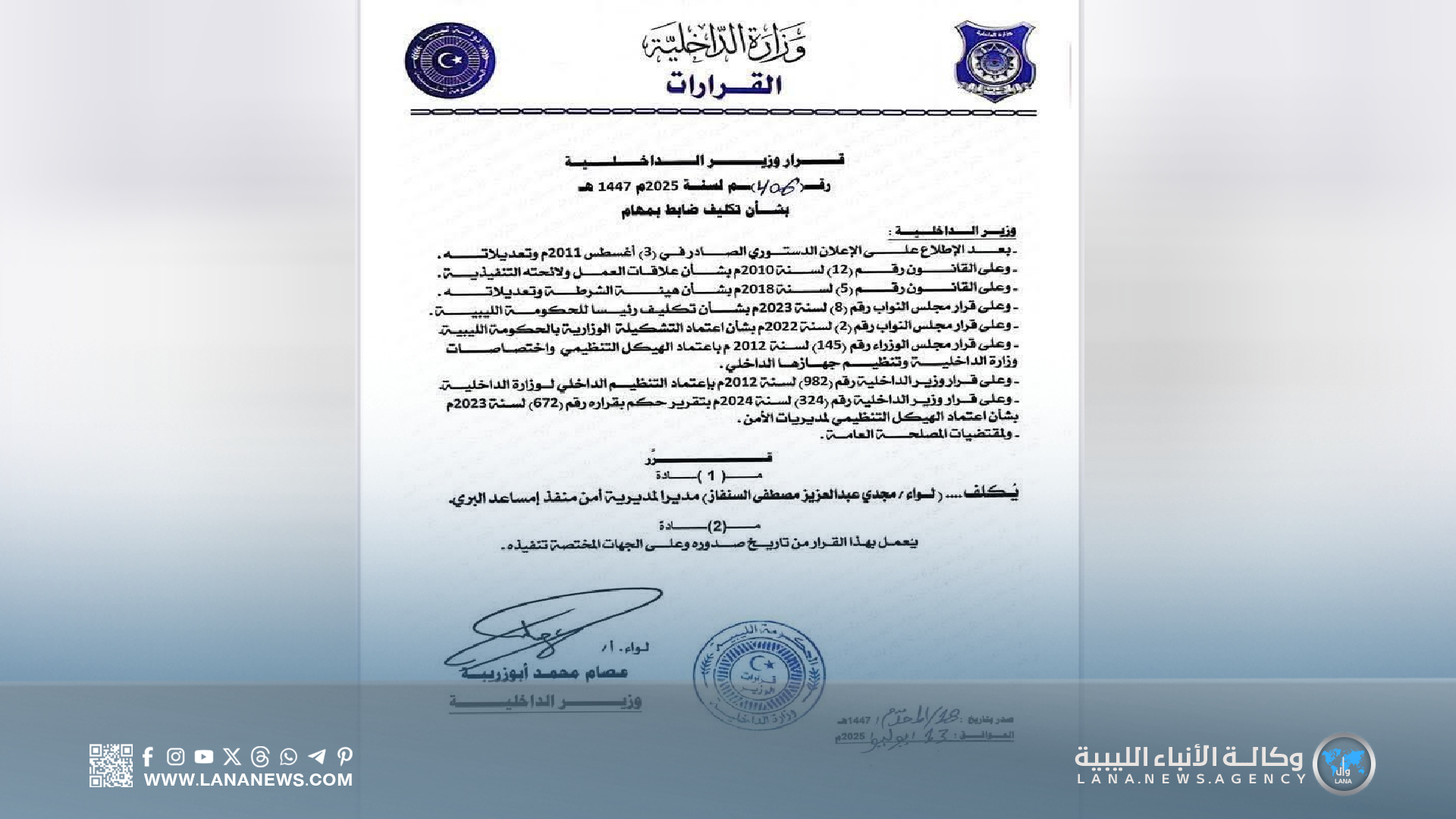 بنغازي 14 يوليو 2025 (الأنباء الليبية) – أصدر وزير الداخلية بالحكومة الليبية، اللواء عصام أبو زريبة، قرارًا يقضي بتكليف اللواء مجدي عبد العزيز مصطفى السنفاز مديرًا لمديرية أمن منفذ أمساعد البري.