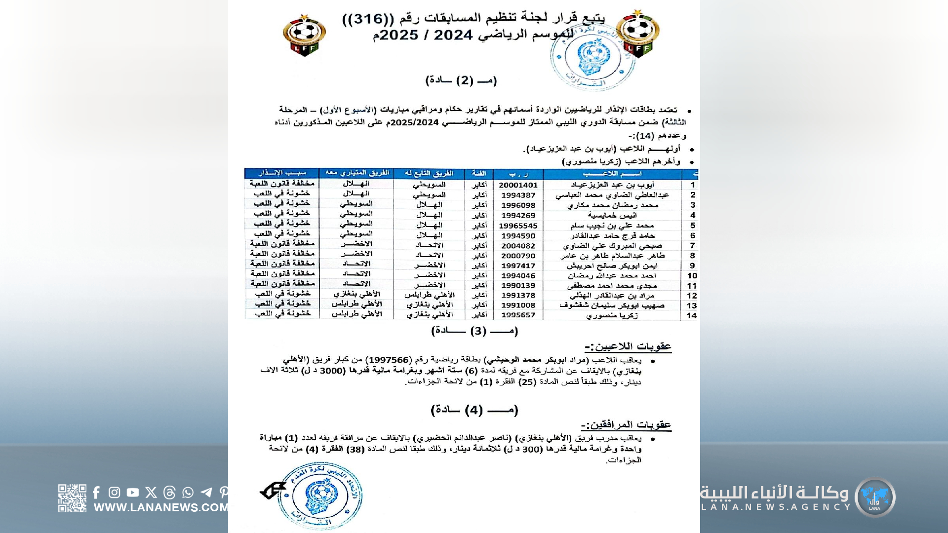 كما تم تغريم نادي الأهلي بنغازي 20.000 دينار ليبي، واعتباره خاسرًا بنتيجة 2-0 في مباراته أمام الأهلي طرابلس، مع خصم 3 نقاط من رصيده في الموسم القادم، بالإضافة إلى غرامة مالية أخرى بقيمة 1500 دينار ليبي، وفقًا للمواد المنصوص عليها في لائحة الجزاءات. (الأنباء الليبية – ميلانو) ر ت