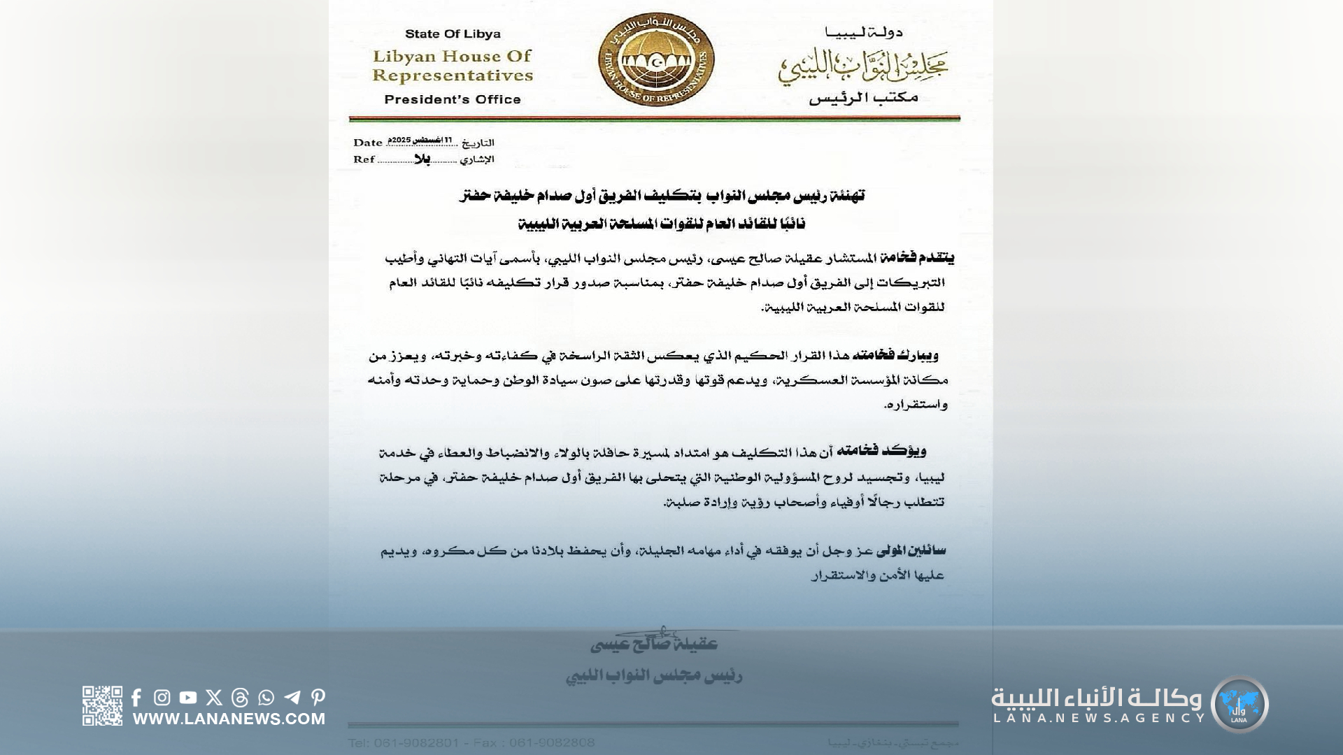 وأكد المستشار عقيلة صالح، في بيان، أن هذا القرار يعكس الثقة الراسخة في كفاءة الفريق أول صدام خليفة وخبرته القيادية، ويأتي في مرحلة حساسة تتطلب تعزيز دور المؤسسة العسكرية في حماية السيادة الوطنية، والحفاظ على أمن البلاد واستقرارها.
