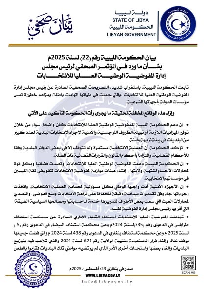 وأكد البيان أن الحكومة الليبية دعمت المفوضية الوطنية العليا للانتخابات وتصدت قضائيًا وبكل قوة للمحاولات التي قامت بها الأجسام المنتهية ولايتها لإنشاء هيئات موازية لمفوضية الانتخابات لتقويض ثقة الليبيين في مؤسساتهم الانتخابية.