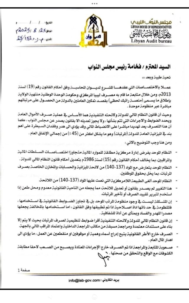 بنغازي 25 أغسطس 2025 (الأنباء الليبية) – حذر رئيس ديوان المحاسبة عمر عبدربه صالح، في مذكرة رسمية موجهة إلى رئيس مجلس النواب المستشار عقيلة صالح من المخاطر القانونية والإدارية والفنية لمنصة “راتبك لحظي” التي أطلقها مصرف ليبيا المركزي مع حكومة الوحدة؛ لتمكين الموظفين الحكوميين من الحصول على مرتباتهم مباشرة عبر منظومة موحدة.