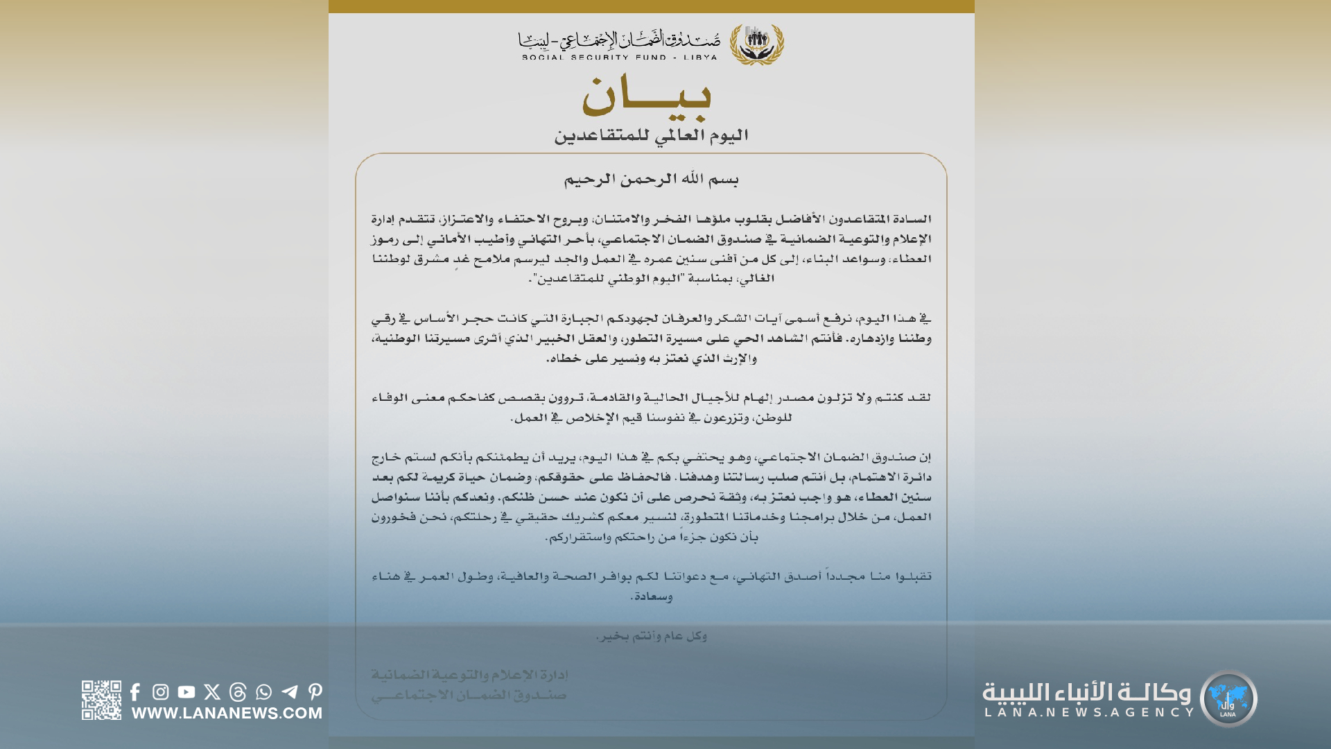 بنغازي 30 سبتمبر 2025 (الأنباء الليبية) – جدّد صندوق الضمان الاجتماعي التزامه بضمان حقوق المتقاعدين، ومتابعة أوضاعهم، وتوفير برامج وخدمات تهدف إلى تحقيق حياة كريمة ومستقرة لهم بعد التقاعد.