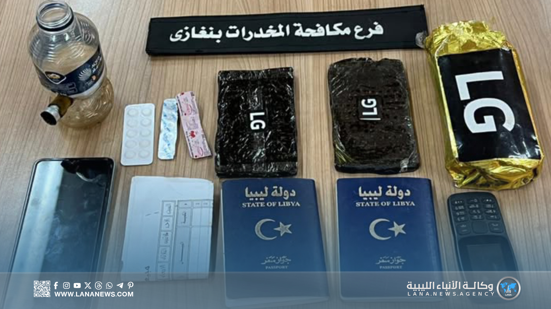 وفي سياق منفصل، تمكن أعضاء جهاز مكافحة المخدرات والمؤثرات العقلية فرع بنغازي من القبض على شخصين بحوزتهما مواد وأقراص مخدرة معدة للاتجار، شملت قطعتين كبيرتين من مخدر الحشيش المعروف محليًا باسم “البسبور”، و15 قرصا مخدرا من نوع “ابتريل”، إضافة إلى أداة تعاط، واتخذت الإجراءات القانونية اللازمة بحق المتهمين وإحالتهم إلى النيابة المختصة لاستكمال التحقيقات.