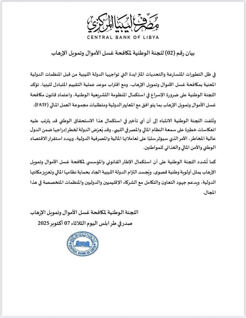 طرابلس 07 أكتوبر 2025 (الأنباء الليبية) – أصدرت اللجنة الوطنية لمكافحة غسل الأموال وتمويل الإرهاب التي يترأسها محافظ مصرف ليبيا المركزي اليوم الثلاثاء بياناً طالبت فيه بضرورة الإسراع في استكمال المنظومة التشريعية الوطنية، واعتماد قانون مكافحة غسل الأموال وتمويل الإرهاب بما يتوافق مع المعايير الدولية.