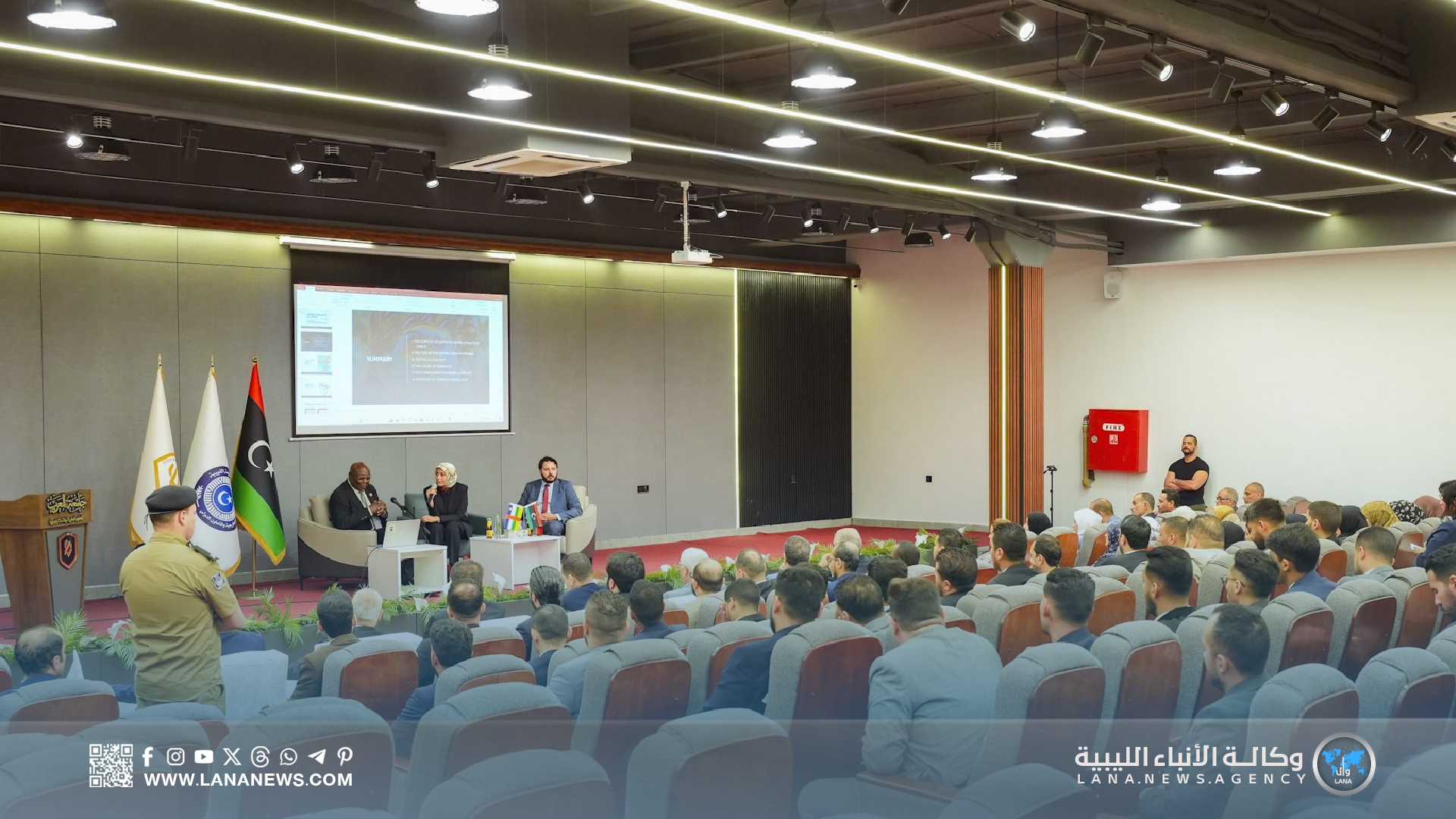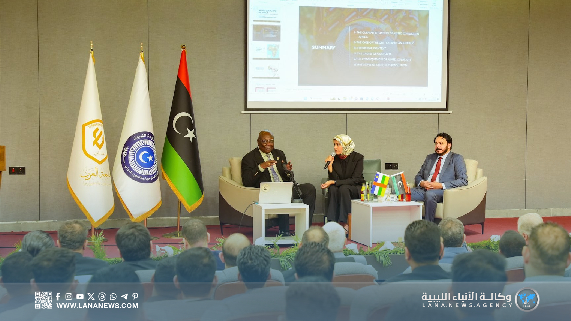 بنغازي 16 أكتوبر 2025م (الأنباء الليبية) – استضافت جامعة العرب للتكنولوجيا، بمدينة بنغازي، اليوم الخميس، رئيس وزراء جمهورية إفريقيا الوسطى الأسبق وعضو البرلمان في إفريقيا الوسطى مارتن زيغيلي، ضمن برامج التدريب والتأهيل الدبلوماسي، حيث ألقى محاضرة متميزة لطلبة معهد الدراسات الدبلوماسية حول “الأزمات الإفريقية وآفاق التعاون المشترك”، مسلطا الضوء على مسار العلاقات الليبية – الإفريقية الوسطى عبر التاريخ وآفاقها المستقبلية.