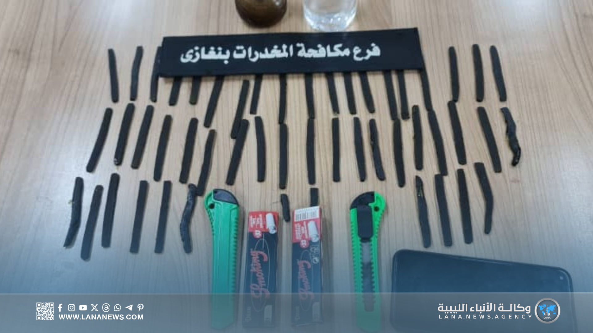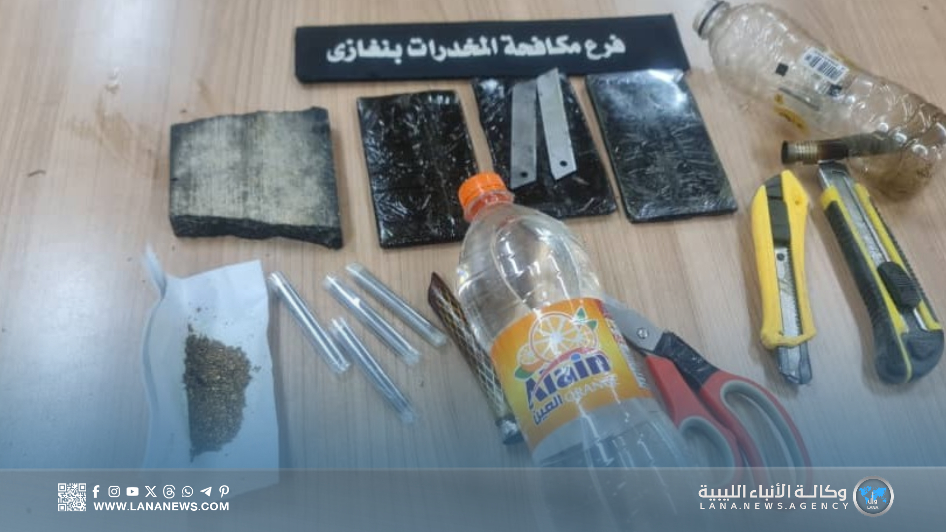 وفي بنغازي، نفذ فرع الجهاز عدة عمليات نوعية أسفرت عن ضبط عدد من المروجين، من بينهم المتهم “م. م. ع” البالغ من العمر 32 عاما، بعد العثور بحوزته على 50 قطعة من الحشيش جاهزة للبيع، إضافة إلى أدوات تعاط وسكينين وشفرتين وعبوة تحتوي على سائل مسكر محلي الصنع، كما ألقى مكتب التحريات القبض على شخص آخر بحوزته 19 قطعة حشيش وأداة تستخدم في التعاطي.
