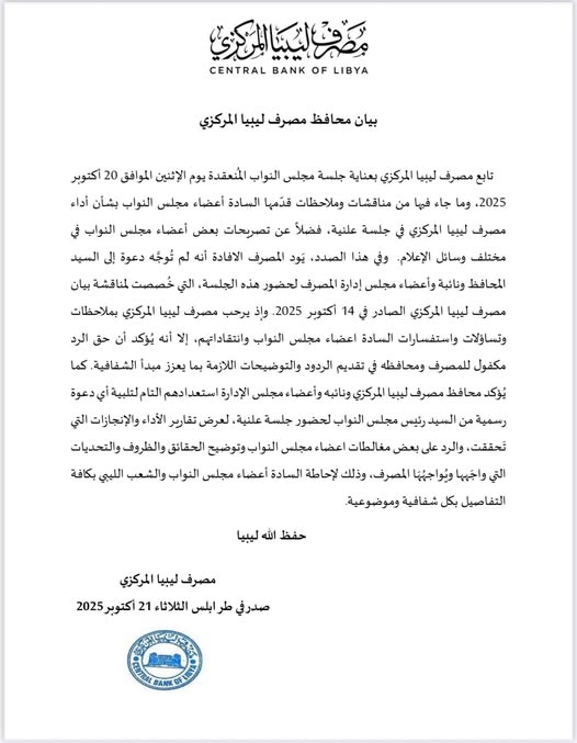 طرابلس 21 أكتوبر 2025 (الأنباء الليبية) – قال مصرف ليبيا المركزي إن محافظ المركزي سيطلب لقاء مع رئاسة مجلس النواب وعدد من رؤساء اللجان المختصة، بهدف توضيح السياسات النقدية والمالية والرد على الملاحظات المتعلقة بأداء المصرف.