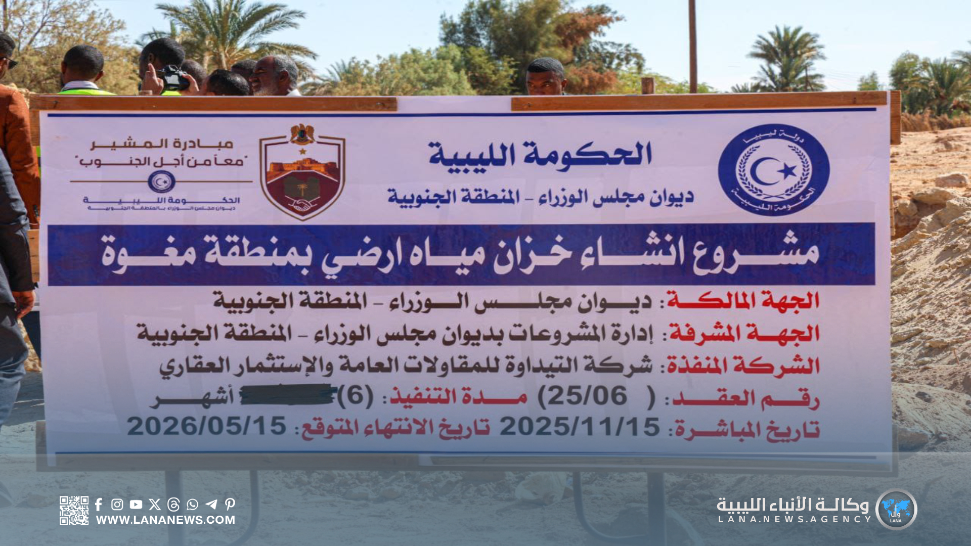 تراغن 18 نوفمبر 2025 (الأنباء الليبية) – أجرى فريق من مكتب المشروعات بديوان مجلس الوزراء – المنطقة الجنوبية، زيارة إلى منطقة مغوه ببلدية تراغن، للوقوف على سير تنفيذ مشروع الخزان الأرضي الجديد، تحت إشراف مُباشر من نائب رئيس الوزراء ووزير الدفاع الدكتور أحميد حومة.