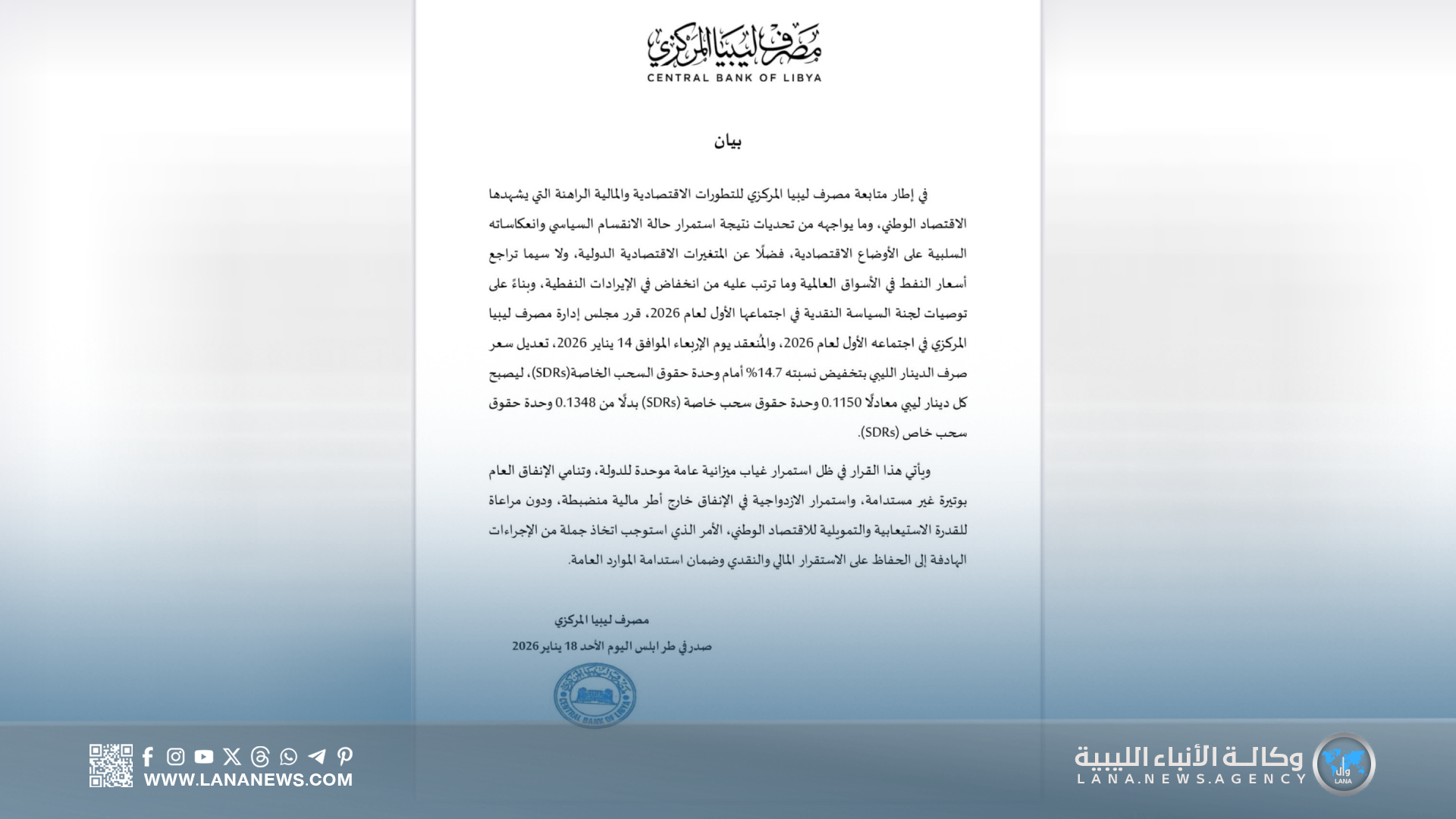 طرابلس 18 يناير 2026 (الأنباء الليبية) – أعلن مصرف ليبيا المركزي، في بيان رسمي، عن تعديل سعر صرف الدينار الليبي أمام وحدة حقوق السحب الخاصة (إس. دي. آر. إس )، عبر تخفيض قيمته بنسبة 14.7 في المائة، ليُحدد السعر الجديد عند مستوى 0.1150 وحدة حقوق سحب خاصة لكل دينار ليبي، بدلا من 0.1348 وحدة معمول بها سابقًا، في خطوة وصفت بأنها استجابة مباشرة لجملة من الضغوط الاقتصادية والمالية المتراكمة.