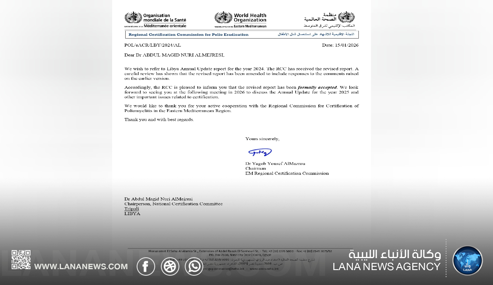 طرابلس 25 يناير 2026 (الأنباء الليبية) – أكد المركز الوطني لمكافحة الأمراض، اليوم الأحد، محافظة ليبيا على خلوها من فيروس شلل الأطفال، مُشيرًا إلى أن البلاد ما زالت ضِمن الدول الحاصلة على شهادة الخلو من المرض من منظمة الصحة العالمية.