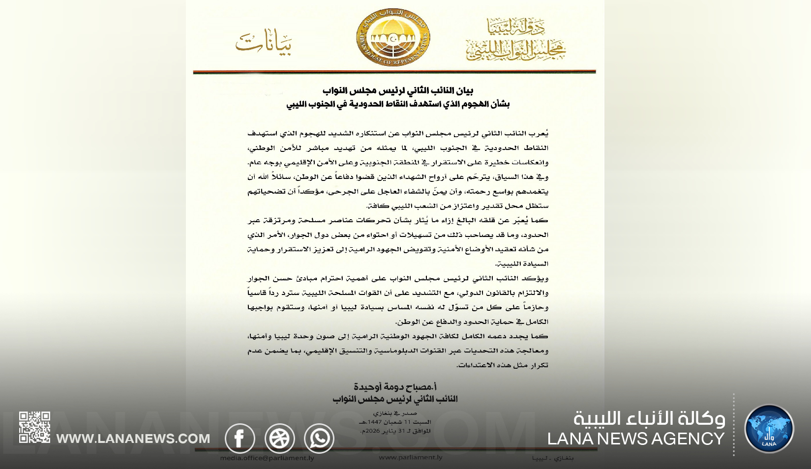 بنغازي 31 يناير 2026 (الأنباء الليبية) – أدان النائب الثاني لرئيس مجلس النواب، مصباح دومة، الهجوم الذي استهدف النقاط الحدودية في الجنوب الليبي، مُؤكدًا أن هذا الاعتداء يُمثل تهديدًا مباشرًا للأمن الوطني وله انعكاسات خطيرة على الاستقرار الإقليمي.