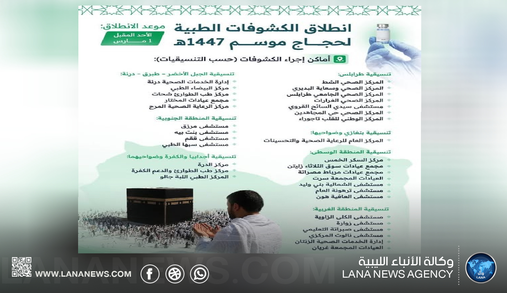 طرابلس 28 فبراير 2026 (الأنباء الليبية) – أعلنت وزارة الصحة، عن الشروع في إجراء الكشوفات الطبية لحجاج بيت الله الحرام لموسم حج 1447هـ، اعتبارا من يوم الأحد المقبل، وذلك في مختلف مناطق البلاد، ضمن الاستعدادات الصحية المصاحبة لموسم الحج.