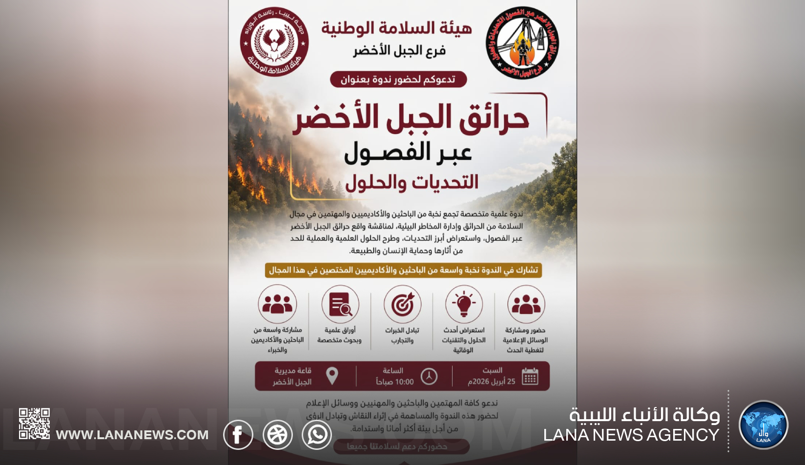 الجبل الأخضر 24 أبريل 2026 (الأنباء الليبية) – تنظم هيئة السلامة الوطنية – فرع الجبل الأخضر، يوم غدٍ السبت، ندوة علمية متخصصة حول “حرائق الجبل الأخضر عبر الفصول.. التحديات والحلول”، بقاعة مديرية الجبل الأخضر، في إطار الجهود الراميةِ إلى تعزيز الاستعداد لمواجهة مخاطر الحرائق.
